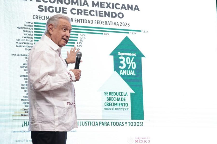 Asi presumió que, hasta el cierre de noviembre pasado, Oaxaca lideraba el crecimiento económico con un 13.1 por ciento, seguido de Tabasco con 11.5 por ciento y Quintana Roo con 8.2 por ciento. Lo cual atribuyó a que incrementó la inversión pública de 500 mil millones de pesos en 2018 a un billón para 2023.